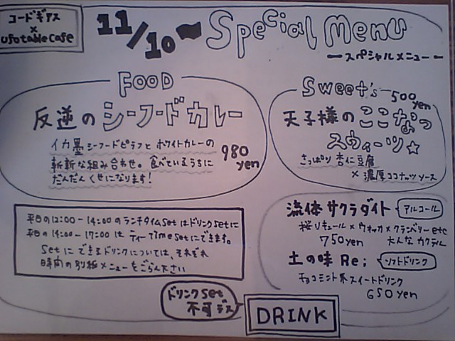 ロフトの上中二階?と下の一階にギアスの展示がありましたが、ものぐさな私は展示が見れる場所のテーブルを陣取り、そこから展示を見てました。